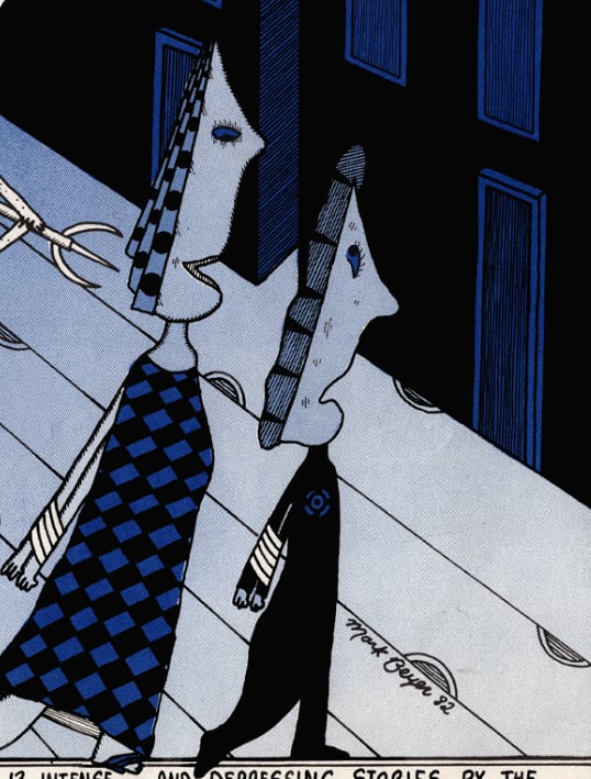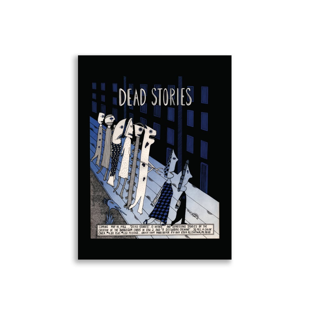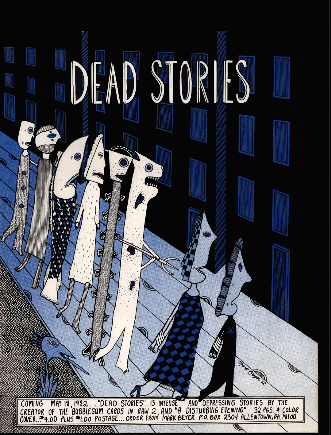 NEW at the Dummy Shop. Mark Beyer's DEAD STORIES cover on a high quality poster. This image comes from a high resolution scan of an incredible rare flyer for this 1982 classic--directly from the Dummy Archives. A museum-quality poster made on thick 12" by 16" matte paper. ALL PROCEEDS FROM THE SALE OF THIS poster WILL GO DIRECTLY TOWARD HELPING MARK PAY FOR THE COSTS RELATED TO A HEALTH ISSUE HE IS CURRENTLY EXPERIENCING. Get a great poster and help a great artist.