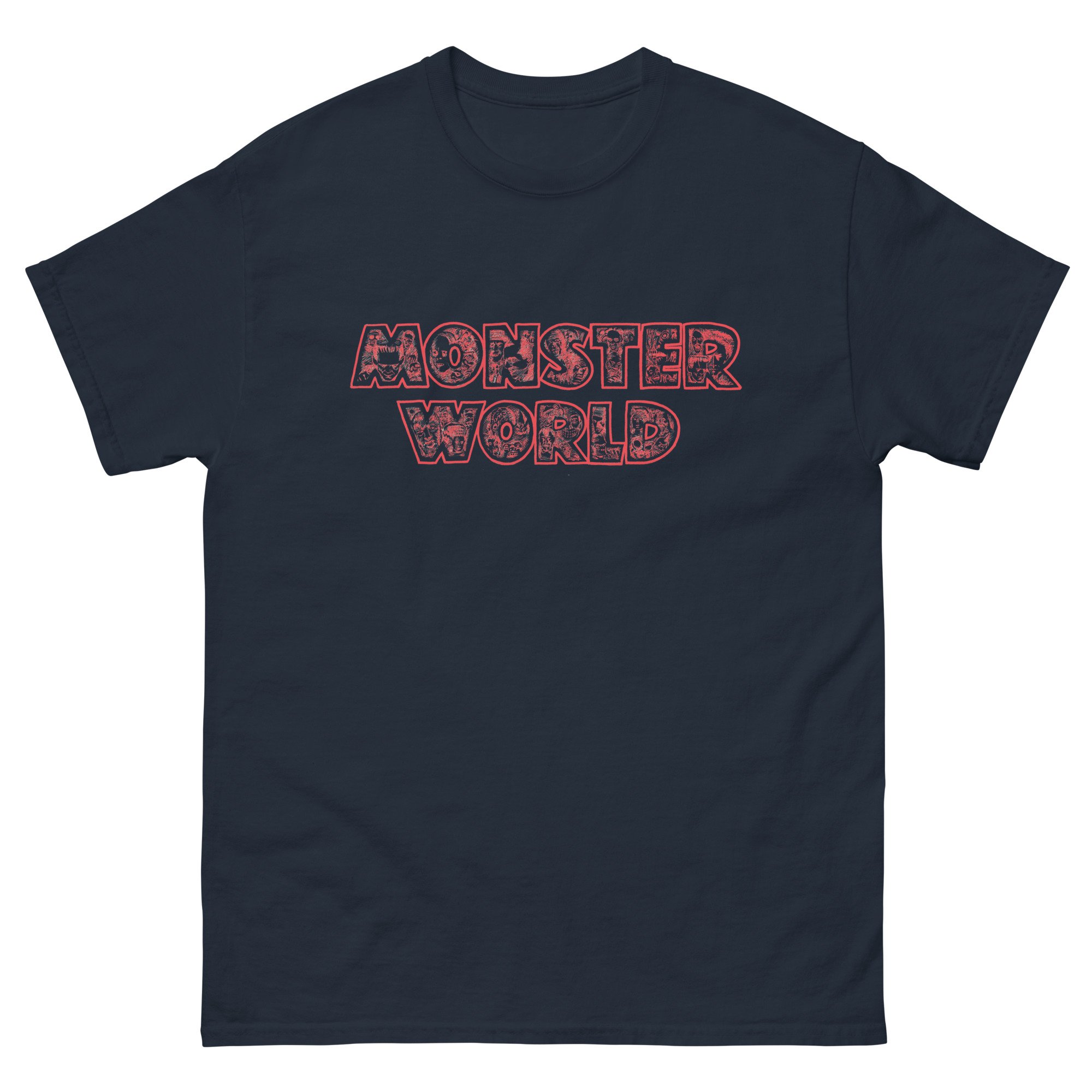 Wallace Wood's 1964 logo for MONSTER WORLD magazine in RED on a high quality Gilden T-Shirt. Multiple colors and sizes.