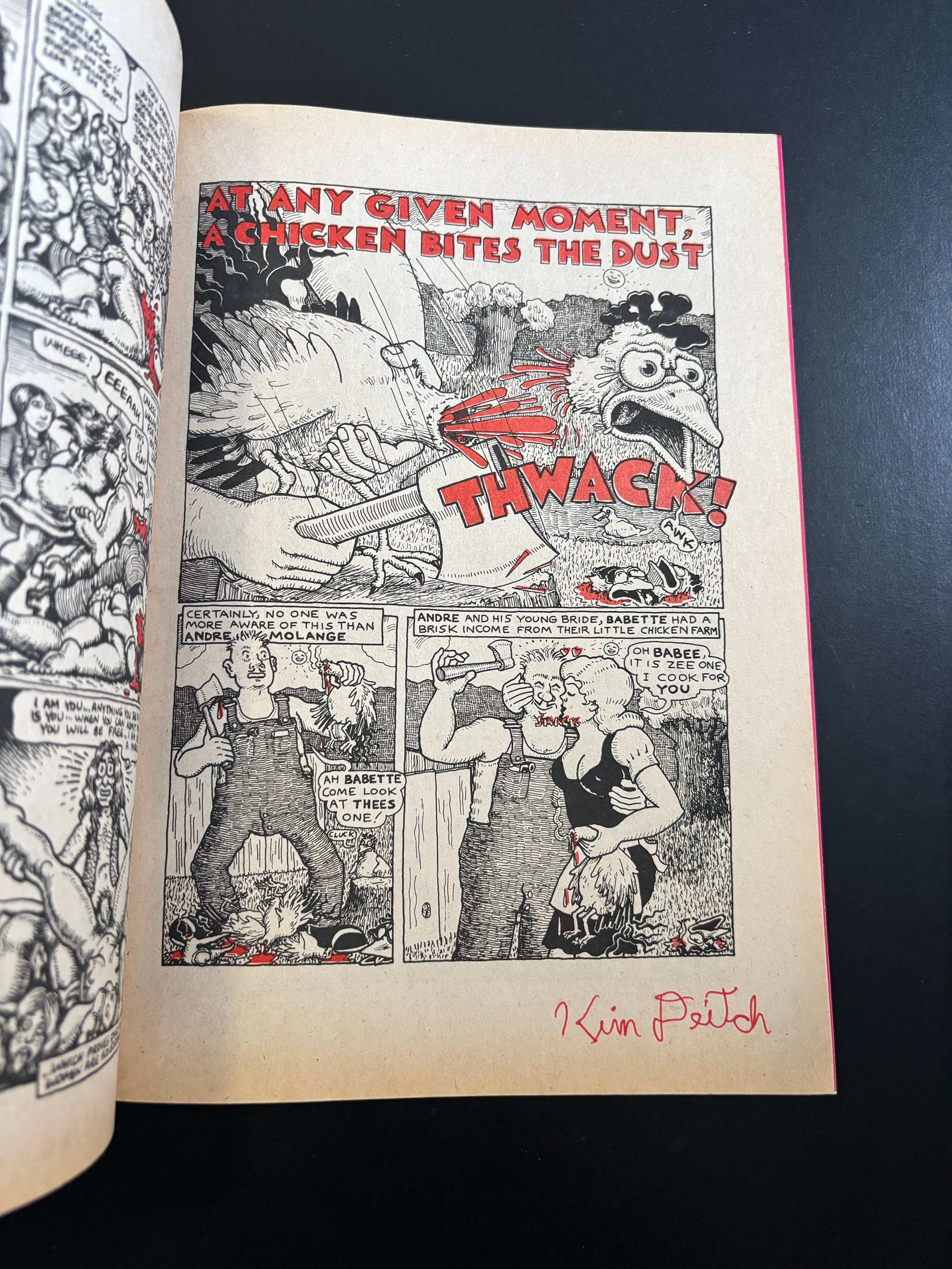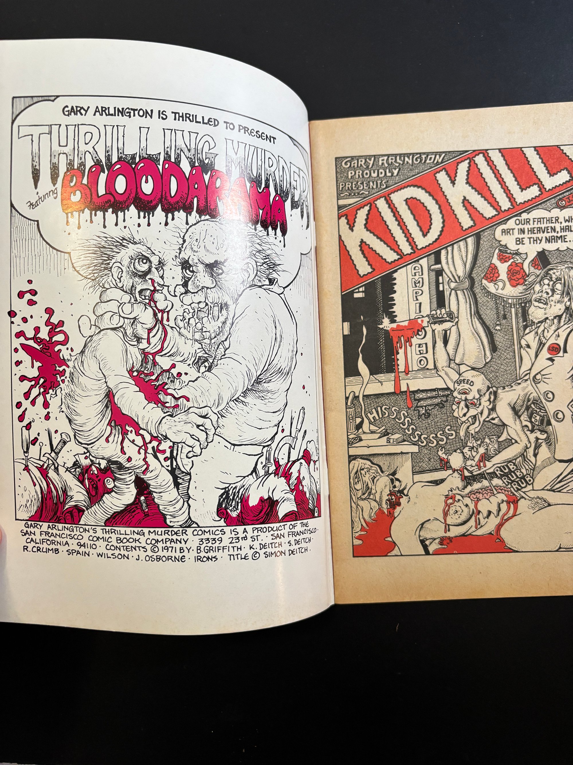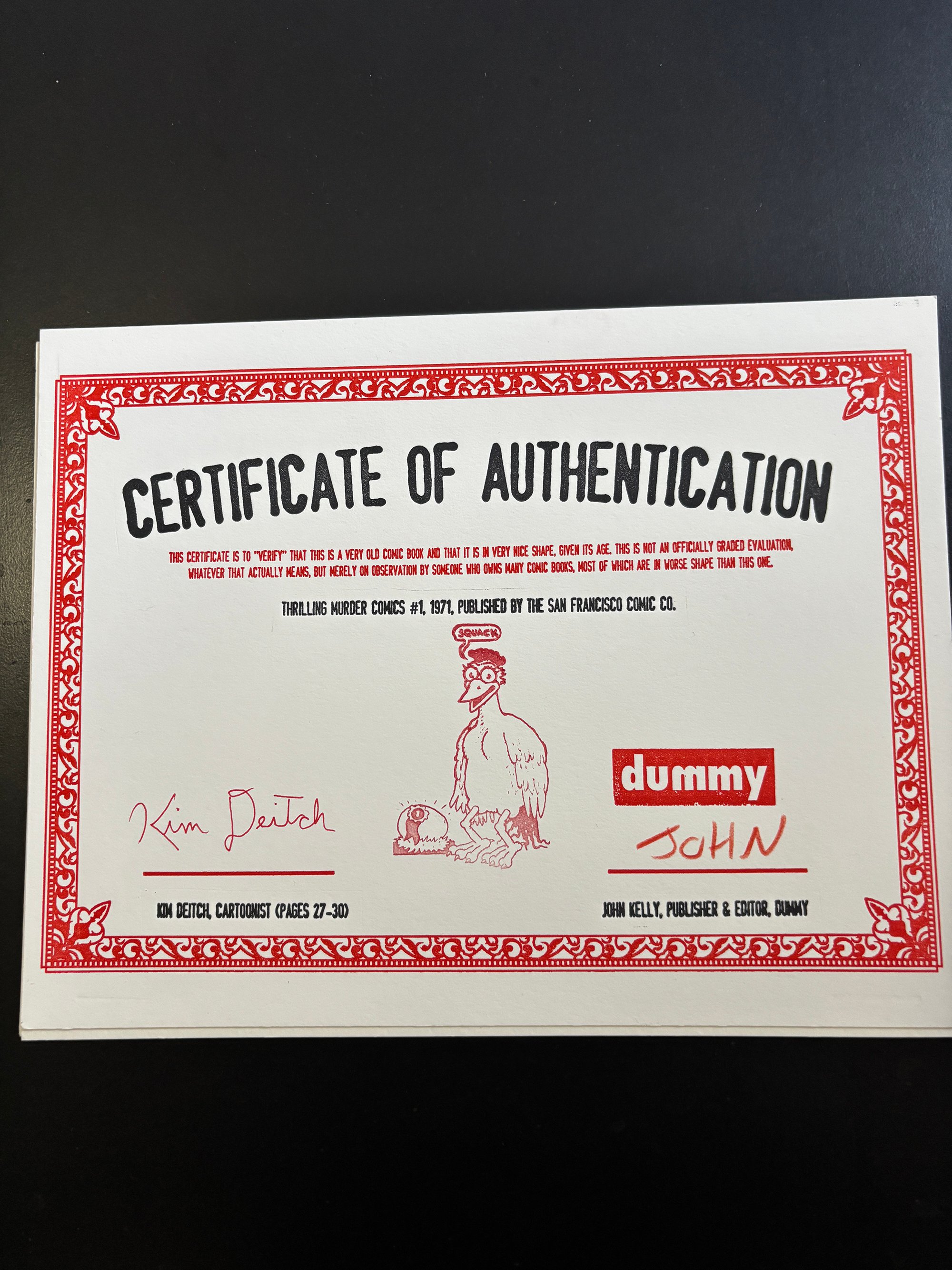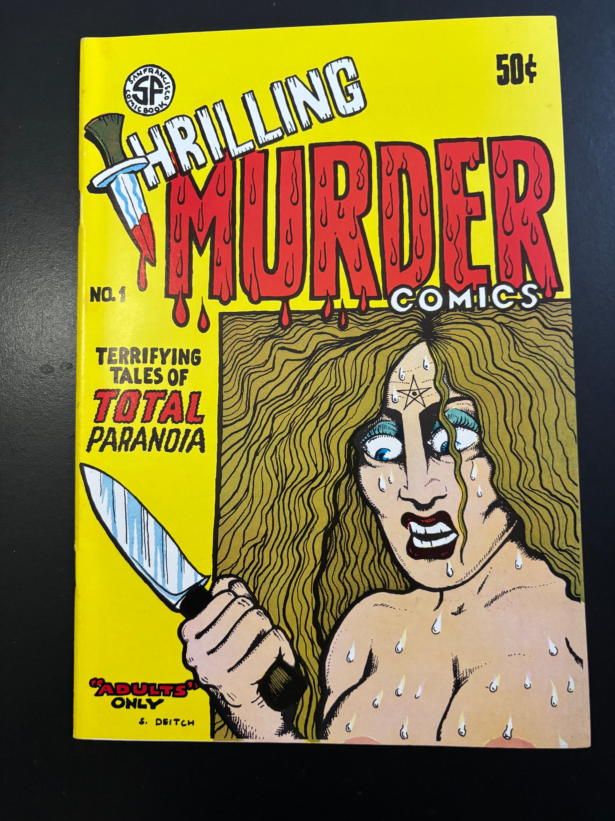 LIMITED SUPPLY: A stunning copy of one of the greatest Underground Comix ever made - THRILLING MURDER #1 - Signed by Kim Deitch. This 1971 beauty features insane front and back covers by Simon Deitch, with grusome inside artwork by Robert Crumb, S Clay Wilson, Spain, Bill Griffith Jim Osborne, Greg Irons and Kim Deitch. Kim signed each copy on the page his story starts. PLUS: Each copy comes with a magnificent letter press printed (meaningless, but cool) CERTIFICATE OF AUTHENTICITY from Dummy, which is signed by Kim and Dummy. Dummy has a small supply of copies of this must have UG classic, all in extremely great shape--They have never been read and have been untouched for 55 years. Supplies are extremely limited. All copies will come bagged and boarded and with the certificate.